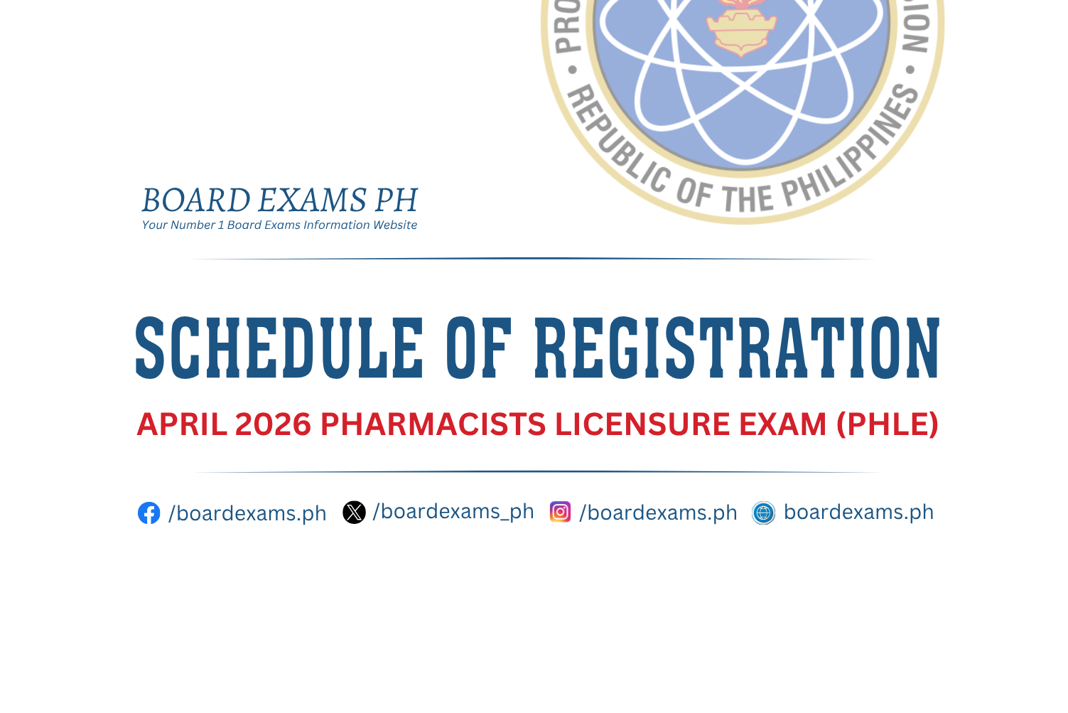 SCHEDULE OF REGISTRATION: November 2025 Pharmacists Licensure Exam (PHLE)November 21, 2025Board Exams PH
