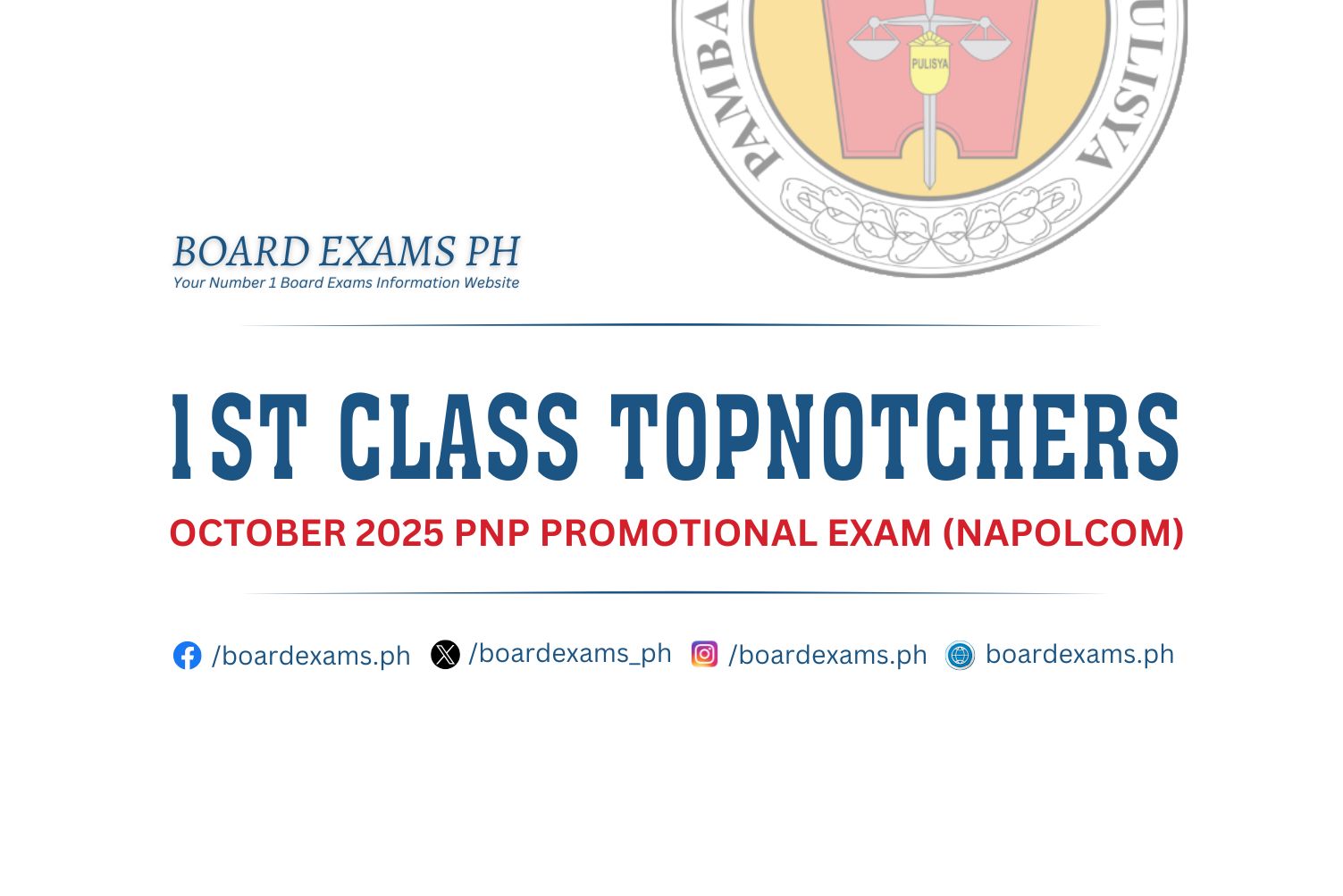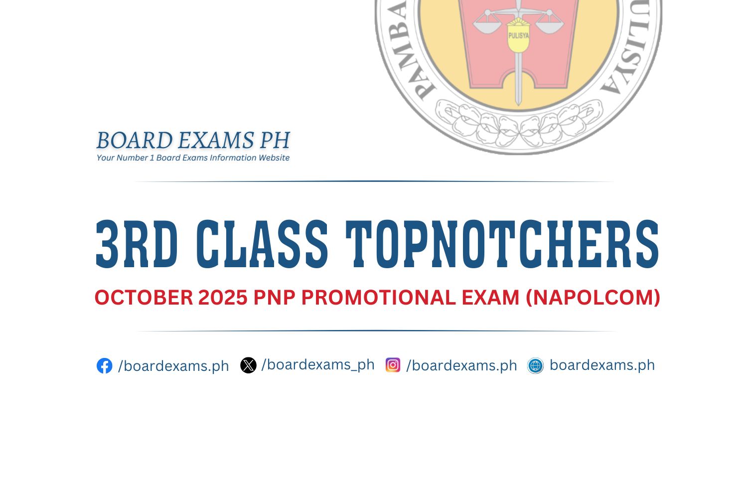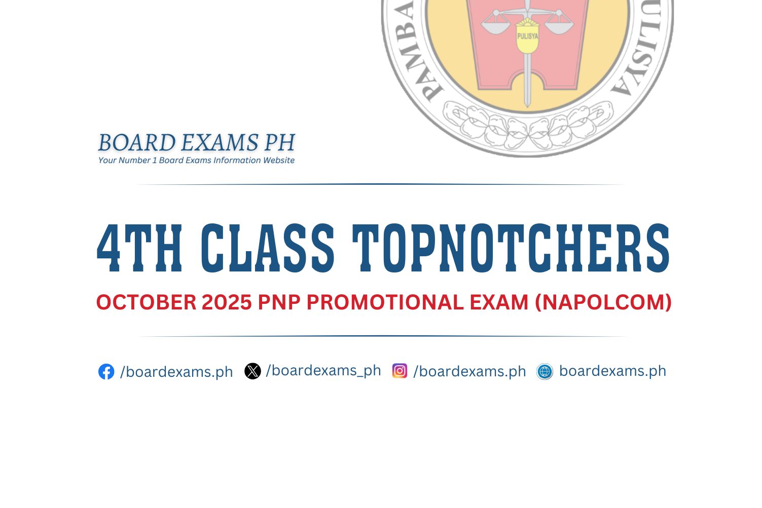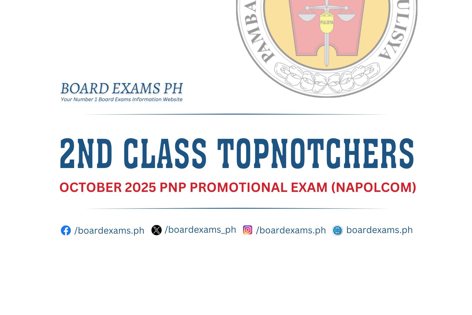 TOPNOTCHERS (4th Class Officers): April 2025 PNP Promotional Exam (PROMEX)June 18, 2025Board Exams PH