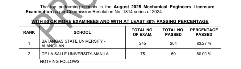 PERFORMANCE OF SCHOOLS: August 2025 Mechanical Engineers Licensure Exam (MELE)