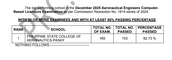 MANILA, PHILIPPINES — The Professional Regulation Commission (PRC) announces that 595 out of 926 passed the Aeronautical Engineers Computer-Based Licensure Examination given by the Board of Aeronautical Engineering in N. C. R., Cagayan de Oro, Cebu, Davao, Legazpi, Lucena, Pampanga and Rosales this December 2025.
