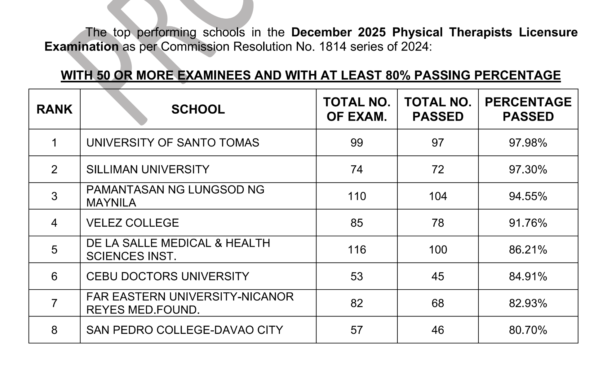 MANILA, PHILIPPINES — The Professional Regulation Commission (PRC) announces that 1,198 out of 1,553 passed the Physical Therapists Licensure Examination given by the Board of Physical Therapy in N. C. R., Baguio, Cebu, Davao, Iloilo, Legazpi, Lucena, Pampanga and Rosales this December 2025. The result of examination with respect to one (1) examinee was withheld pending final determination of his/her liabilities under the rules and regulations governing licensure examinations.