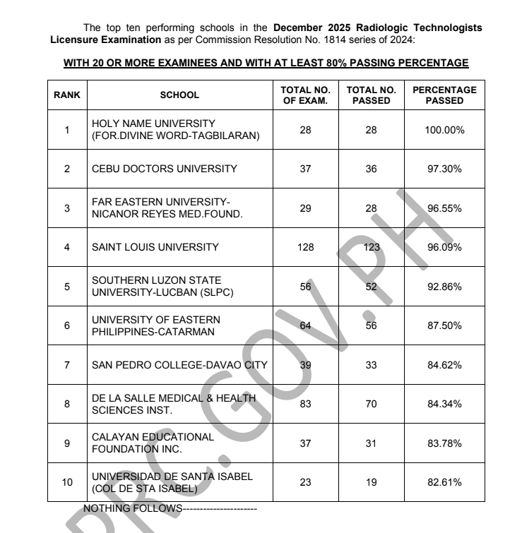 MANILA, PHILIPPINES — The Professional Regulation Commission (PRC) announces that 2,629 out of 4,419 passed the Radiologic Technologists Licensure Examination given by the Board of Radiologic Technology in N. C. R., Baguio, Butuan, Cagayan de Oro, Cebu, Davao, Iloilo, Koronadal, Legazpi, Lucena, Pampanga, Rosales, Tacloban, Tuguegarao and Zamboanga this December 2025.