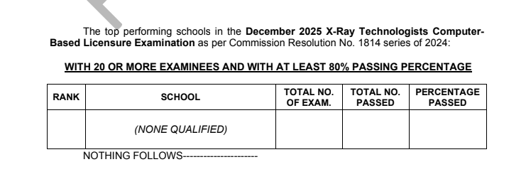 PERFORMANCE OF SCHOOLS: December 2025 X-Ray Technologists Licensure Exam (XTLE)