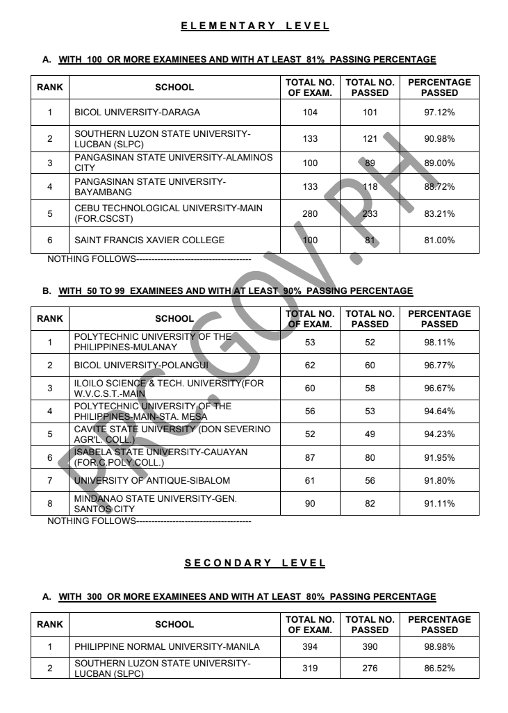 The Professional Regulation Commission (PRC) and the Board for Professional Teachers (BPT) announces that 16,282 elementary teachers out of 34,810 examinees (46.77%) and 38,747 secondary teachers out of 62,225 examinees (62.27%) successfully passed the Licensure Examination for Professional Teachers (L. E. P. T.) given last March 23, 2025 in 38 testing centers all over the Philippines. It is further announced that of the 16,282 elementary teacher passers, 13,819 are first timers and 2,463 are repeaters. For the secondary teachers, 32,624 passers are first timers and 6,123 are repeaters.