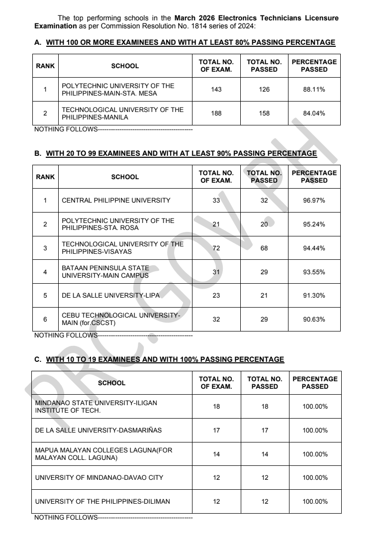 MANILA, PHILIPPINES — The Professional Regulation Commission (PRC) announces that 1,907 out of 2,440 passed the Electronics Technicians Licensure Examination given by the Board of Electronics Engineering in N. C. R., Baguio, Butuan, Cagayan de Oro, Cebu, Davao, Iloilo, Koronadal, Legazpi, Lucena, Pampanga, Rosales, Tacloban, Tuguegarao and Zamboanga this March 2026.