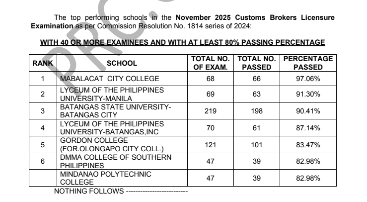The verification of ratings for the November 2025 Customs Brokers Licensure Exam (CBLE) results will be available online a few working days after the posting of results.