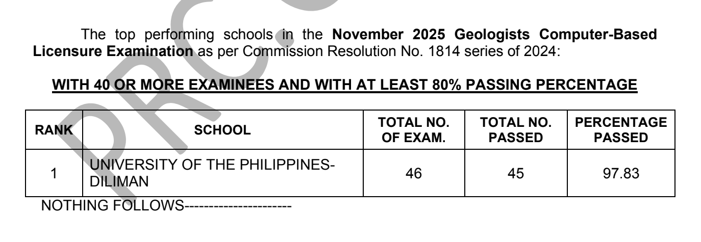 MANILA, PHILIPPINES — The Professional Regulation Commission (PRC) announces that 191 out of 296 passed the Geologists Computer-Based Licensure Examination given by the Board of Geology in NCR this November 2025.