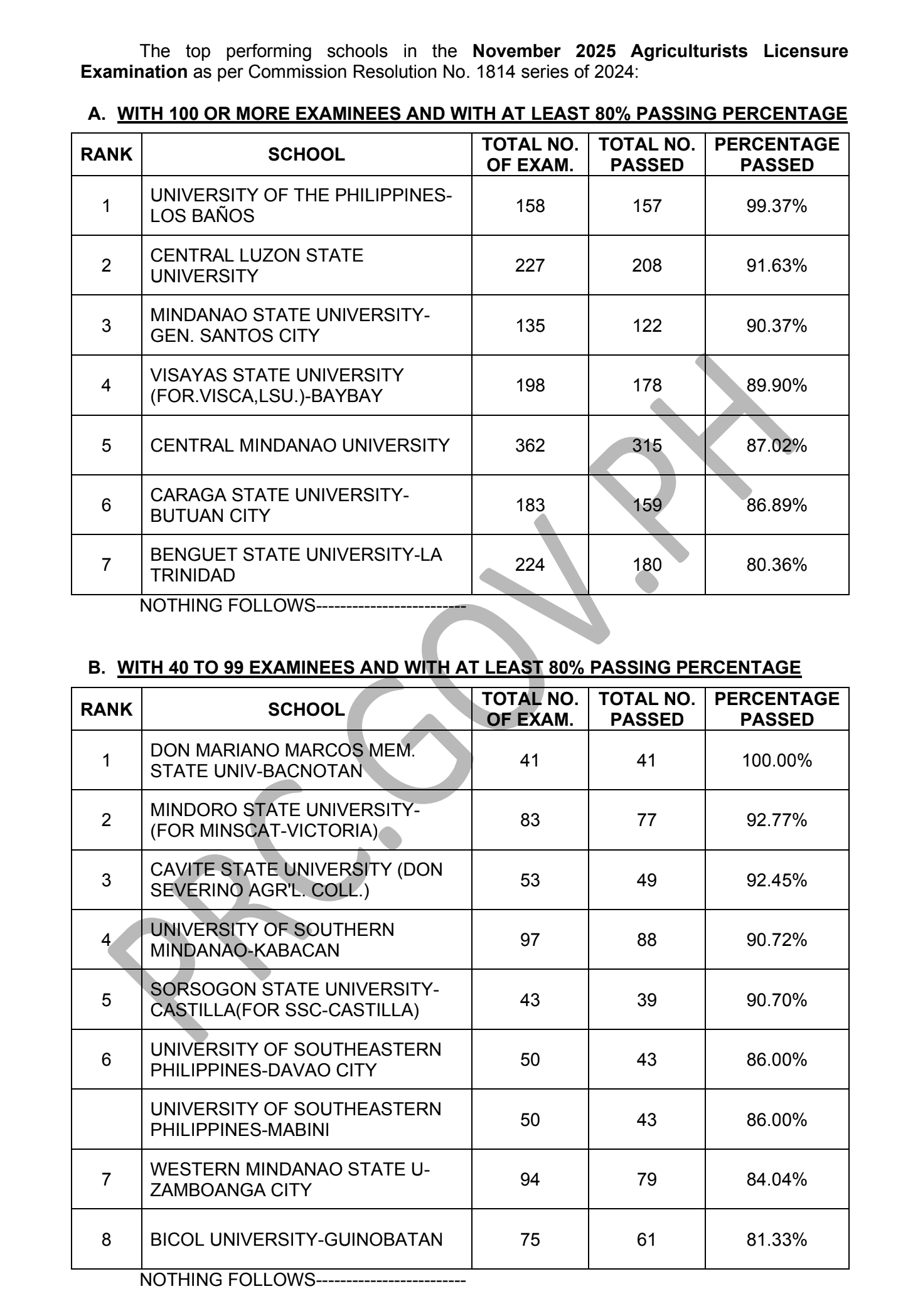 MANILA, PHILIPPINES — The Professional Regulation Commission (PRC) announces that 6,678 out of 9,742 passed the Agriculturists Licensure Examination given by the Board of Agriculture in 18 testing centers all over the Philippines last November 2025. The result of examination with respect to one (1) examinee was withheld pending final determination of his/her liabilities under the rules and regulations governing licensure examinations.