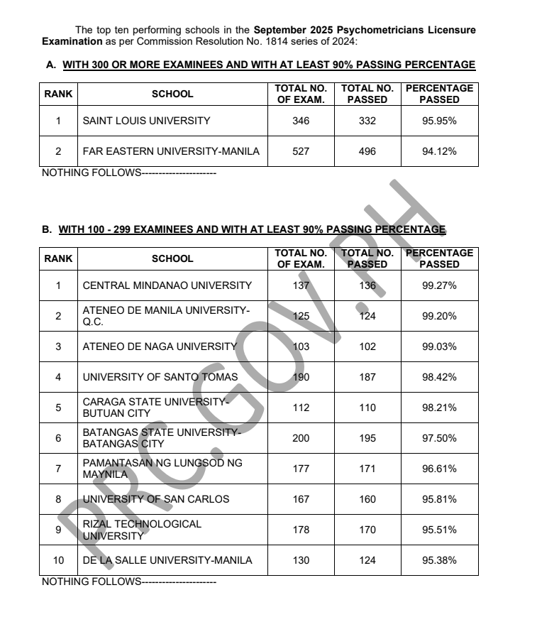 MANILA, PHILIPPINES — The Professional Regulation Commission (PRC) announces that 12,416 out of 14,275 passed the Psychometricians Licensure Examination given by the Board of Psychology in N. C. R., Baguio, Cagayan de Oro, Cebu, Davao, Iloilo, Koronadal, Legazpi, Lucena, Pampanga, Rosales, Tacloban, Tuguegarao, Zamboanga and Puerto Princesa, Palawan last September 2025. The results of examination with respect to two (2) examinees were withheld pending final determination of their liabilities under the rules and regulations governing licensure examinations.