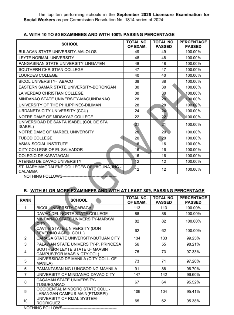 The verification of ratings for the September 2025 Social Workers Licensure Exam (SWLE) results will be available online a few working days after the posting of results.