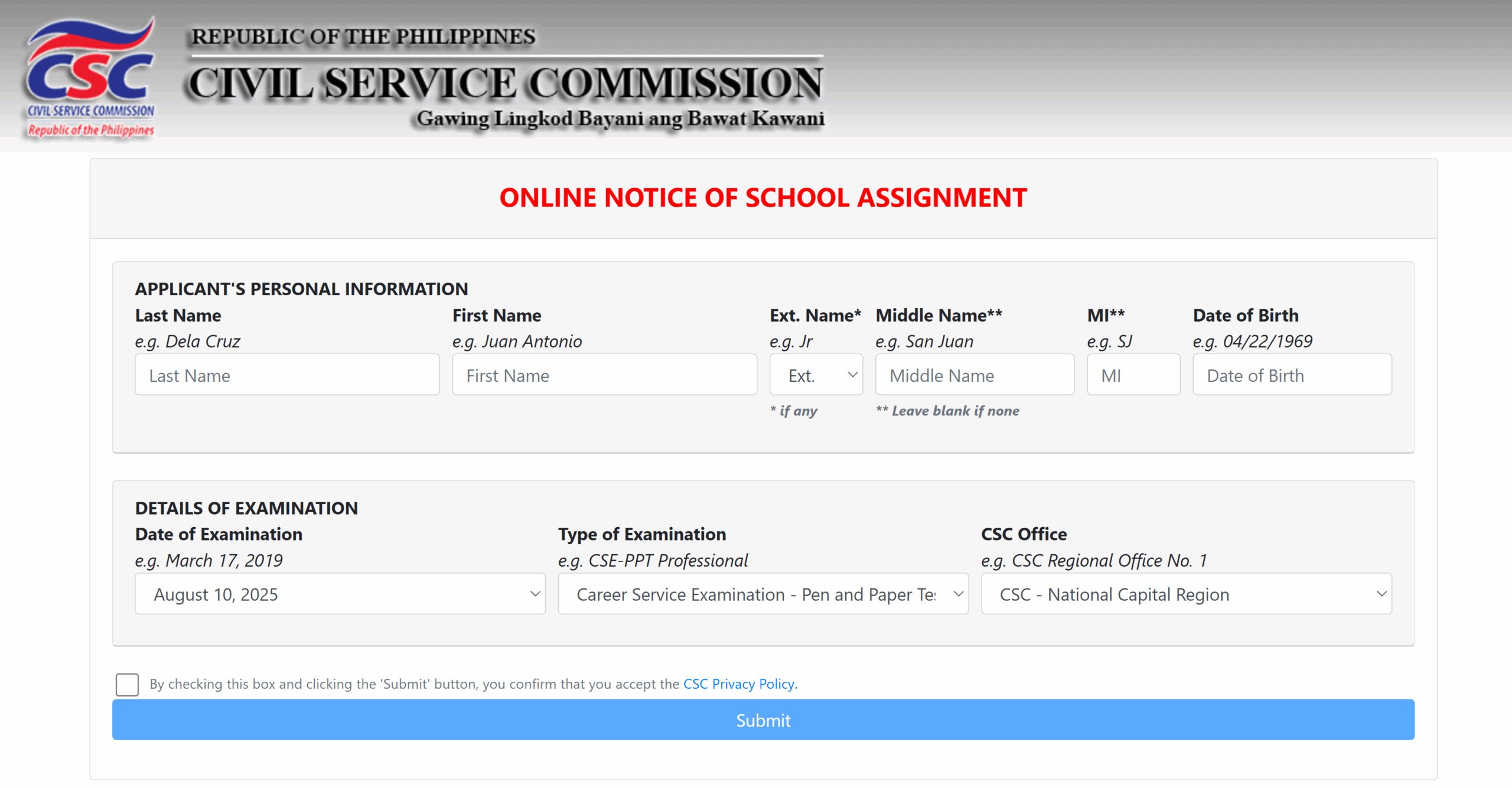 Examinees’ testing venue or school assignment for the August 2025 CSE-PPT (Professional and Subprofessional Levels) may be generated using ONSA or the Online Notice of School Assignment. The CSC Regional Offices (ROs) though may also initiate/utilize individual approaches in disseminating information on school assignments of their respective examinees. Examinees may check the availability of ONSA, through the CSC Website at www.csc.gov.ph, a week before the exam.